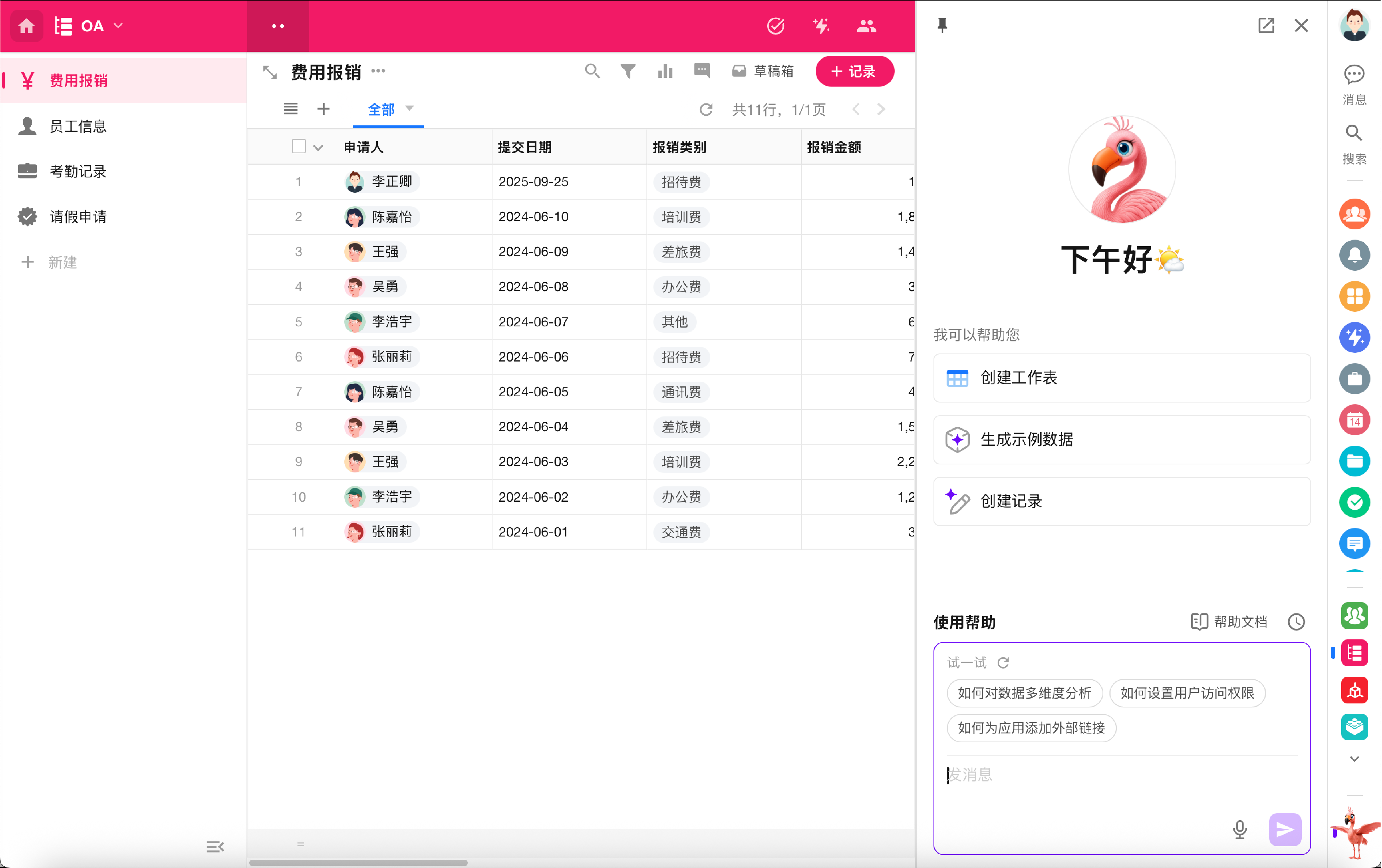 Mingo 可为新建的工作表生成贴近真实业务的示例数据,帮助用户在测试和演示时快速拥有可用的数据集。