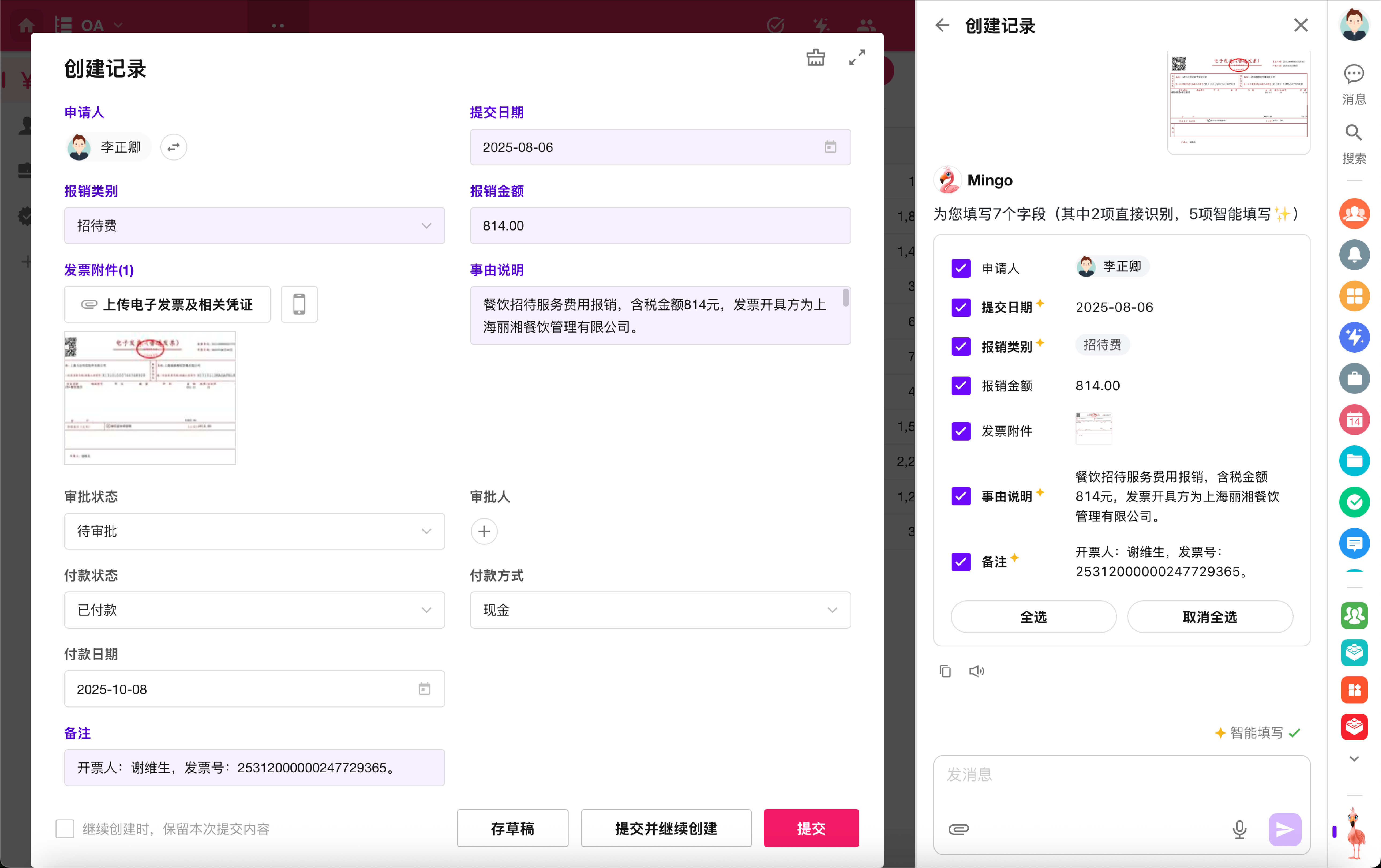 在用户输入部分信息的情况下,Mingo 能结合上下文、行业常识或联网搜索,推理并补全表单中的其他字段,减少人工输入,提高数据录入完整性与准确性。